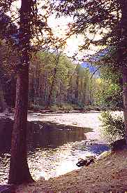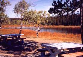 Postcard: August 21, 1998 Fishing the Chilcotin If a person came by who was out granting wishes,  We cleared the Hill and headed for the lake country of the Chilcotin. We planned on spending several days fishing these intriguing small lakes and exploring the countryside. We started at Anahim Lake. There are two small fishing resorts here, neither especially busy at this time of year. Like all the fishing resorts here, they will guide you fishing, or take you hunting in the fall. They will fly you to the remoter lakes of the area, for the "trophy trout". They will take you flightseeing or show you the best hikes. We stayed at Escott Bay Resort. Here there are several small cabins, and a grassy campground with water and electric hookups. The fishing was wonderful. Tom caught so many rainbow trout that he had to make a rule: don't keep anything smaller than the last one. This lake spoiled us, for Lady Luck wasn't with us as much at other lakes. But besides fishing them, the lakes here are beautiful just to look at. Clear blue water, sometimes ice blue water, green forested hills, lovely streams and rivers. Not just a fisherman's paradise, but a nature lover's as well. Waterfowl everywhere. Ducks of every description. White Pelicans can be found here in the summer. One day at Escott Bay, then we explored further. Our destination was Puntzi Lake less than 100 miles east. But there were a lot of lakes between us and Puntzi. Nimpo Lake is only 15 miles down the road. It too, has many places to camp, reported excellent fishing, and the same "fly-in" amenities. The one spot we looked at here, Pine Point, was completely full owing to a small caravan (14 units) which occasionally happens by. Continuing toward Puntzi, we explored Clearwater Lake, but here it was too windy to fish. A few miles further on, we stopped at One Eye Lake. This would have been a great lake to fish had we had a boat. There is a nice British Columbia Forest Campground, and only one person who looked as if he would stay overnight. We haven't a boat with us, so we made it a lunch stop. Enter the Robbers. We were sitting on a picnic table, lost in the idyllic scenery around us. Just what they wanted! In the blink of an eye, one Canadian Gray Jay landed on Tom's sandwich, while it was still in his hand, and flew away with a big chunk! Tom yelled, but it was far too late. These were the two aptly named camp robbers, who flew to a branch of a nearby tree, and continued to eye his sandwich. Tom covered what was left with his free hand, and ate more conscientiously. Eagle Lake is 6 km off the road, again with a nice campsite. The lake is ice blue, and quite shallow around the shoreline. Too shallow for fishing. Off again to Puntzi Lake. Puntzi is large enough to easily accommodate its 5 fishing resorts. We stopped at Puntzi Lake Resort. As we entered the campground we were treated to a picture of "Longball Walter" -- a fish with a golf club over his shoulder! They have a driving range and practice green . We had a large and level grassy campsite, with electric and water, and a large field where they encourage you to exercise your dog. So Missy had lots of room to roam, and loved it. But this lake's fishing left something to be desired. It seems to be the wrong season for really good fishing, which should pick up again when the weather gets cooler. So we will be off again tomorrow to see what other lakes we can find.