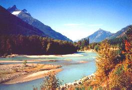 The ferry terminal is located at the end of a long fjord (North Bentinck Arm). The village of Bella Coola is some three kilometers up the Bella Coola river valley. In that three kilometers we saw easily a hundred bald eagles, seasonally attracted to the area by the spawning salmon. We didn't know what services would be available at Bella Coola. But we quickly found that it has an excellent full-service supermarket and hardware store, where the visitor can buy just about anything one might want. Since the trip from Port Hardy is done with propane tanks closed and sealed (no refrigerator), Bella Coola is an obvious choice for stocking the refrigerator for the next several days' exploring. For the first night's stay we settled on the Gnome's Home RV Park in Hagensborg, a small colorful Norwegian village located ten miles east of Bella Coola. The owner/manager, Karl Osmers, was most helpful in pointing out many of the "must see" places in the Bella Coola valley. His RV park, offering 40 full service sites on 20 acres, provides its own private area to explore -- a large chunk of old growth timber, enlivened by small creeks (complete with spawning salmon during our visit), and all made accessible by a carefully laid trail comprised of 4" x 12" timbers which wander through this pristine forest. We'd heard much about the large population of "urses americanus" (black bear) and "urses horribilis" (grizzly bear) in the Bella Coola valley. Here we could see the trails they'd carved through this old growth rainforest "jungle". We'd interject a note for the satellite TV aficionados. DirecTV disclaims any coverage in Canada, as it apparently has no license there. Accordingly, it does not provide any information about just how far north into Canada its coverage extends; nor does it provide information on the elevation and azimuth to catch the signal. We found it with a little trial and error at 24.5 degrees elevation, and 128 degrees on the compass, with a signal strength of 76.. We found Gnomes Home a most pleasant base camp for exploring the Bella Coola valley. Unfortunately, it seems all too many travelers disembark the ferry at Bella Coola, and don't slow down until they've driven through the Bella Coola valley and topped "The Hill" (see below), the 11 miles of grade which challenge vehicle and driver alike. Unfortunately for these visitors, they've just sped by some of the most fantastic opportunities and scenery available anywhere in the world. The valley is bordered by high granite cliffs, rising nearly 10,000 feet, and more than rivaling the vistas in Yosemite National Park. Much better vistas -- and almost no people! The extensive river system traversing the valley, some glacial in color, host some of the largest salmon and steelhead runs on the planet. Government campgrounds in Tweedsmuir Provincial Park -- the largest in BC -- offer well maintained (no service) primitive sites in a pristine forest environment, with a never ending view in all directions. The small but elegant Tweedsmuir Lodge is a "must see" -- if only to check out the incomparable view from its flower laden front deck. Jutta (pronounced "Uta") is the very gracious innkeeper. Of German descent, and a resident in winter months of Vancouver Island, she maintains this small 7 room lodge and 2 cabins, and is a delightful hostess for visitors. With beautiful internal furnishings, the lodge seemed to us a miniature equivalent of the famed elegant Ahwanee Lodge in Yosemite. But again -- without traffic, noise, or any obvious sign of crowds. This seemed to us the ultimate in peace and quiet... Once we'd passed the second campground in Tweedsmuir, some 50 miles from where we'd landed at the ferry terminal, we shortly found ourselves looking up -- almost straight up it seemed. The road had now lost its paved surface and headed up the grade which will be remembered by all who visit here -- "The Hill". But read on...