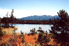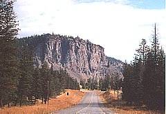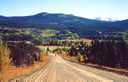 Heckman Pass to Anahim Lake. By the time one reaches the top of the pass, the terrain begins to look quite different. Gone are the old growth cedar, spruce and fir. In their place, an alpine setting of smaller lodgepole pines, and sweeping vistas into the colorful, rocky slopes of the Rainbow Range. Just past the summit a trailhead invites hikers for a closer look, with trails ranging from one to 21 days -- some involving significant changes of elevation. Here, as everywhere, one finds warnings about bears (Black Bears & Grizzly Bears live here) -- they can be anywhere, anytime. But be particularly watchful in avalanches, berry patches, and along stream beds -- particularly where one may find spawning salmon. The road here, still gravel, is in places a bit rougher than that encountered on the hill. In places it has been oiled to keep the dust down. But vehicles are few and far between, providing a feeling of being somewhere in a vast, last wilderness. Small lakes dot the landscape, and small creeks criss-cross the wandering roadway. You're now in an area which still belongs to the wildlife -- bear, deer, moose, wolves, cats (not kitties!). One has a feeling of being a visitor to one of the last wilderness area which they still claim as their own.